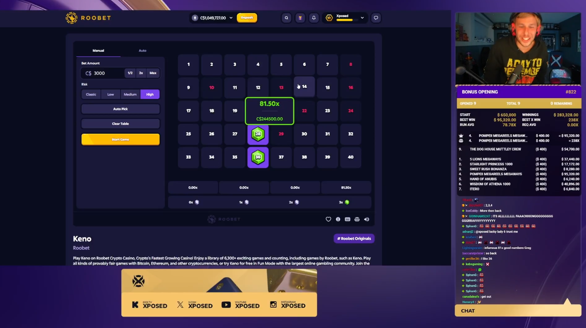 - Xposed - C$3,000 - C$244,500: Xposed also picked three numbers - 20, 28, and 36 - and thanks to a much larger bet amount, the 81.50x returns were worth $244K.
