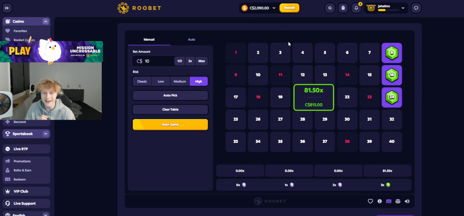 - Jahstin___ - $10 to $815.00 (x2): Jahstin’s three numbers were also in a row on the board - 8, 16, and 24 - and all three were matched with the RNG numbers for 81.50x and an $815.00 payout. He did this twice in a row to turn $20 worth of bets into $1,630.